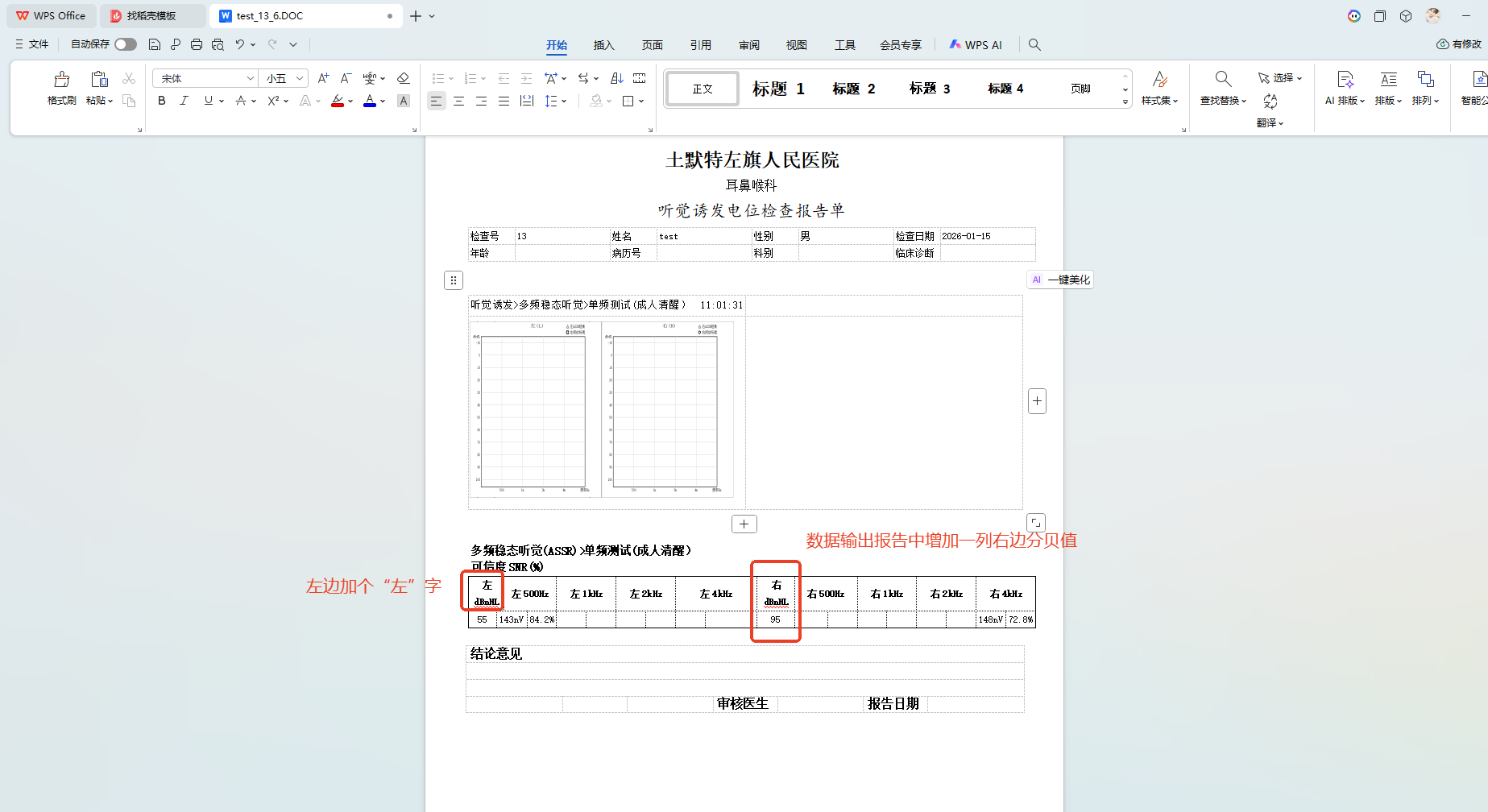 1、老师是想左右耳的数据前面分别有声音强度的显示表格,还有就是如果左右耳起始声音强度不同,比如一个60,一个35,最后输出的报告,左右耳都是从60开始显示数据
